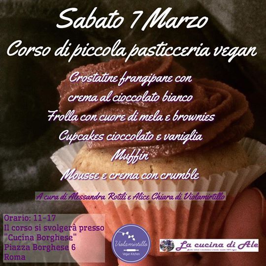 Muffin, cupcake, frolle ripiene e tante altre golosità. Il 7 marzo io e Alice Chiara torniamo a impastare insieme per un corso di piccola pasticceria senza derivati animali: ingredienti 100% vegetali e tutto rigorosamente fatto in casa. Un nuovo appuntamento dopo il bellissimo pomeriggio trascorso con la pasticceria salata. La location è sempre quella di Cucina Borghese, in Piazza Borghese 6 (sopra la libreria Kappa) nel cuore di Roma. Dalle 11 alle 17 per una full immersione di golosità... per info e prenotazioni