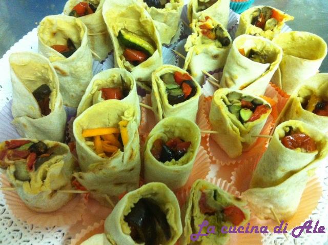 - Primo step: l'impasto. Disponete la farina a fontana, unite il lievito (per chi è intollerante può fare la piada senza e viene benissimo lo stesso), il sale, l'olio e cominciate a incorporare. Unite poi l'acqua fredda e cominciate a lavorare l'impasto con le mani. Quando le quantità aumentano io uso anche l'impastatrice... Una volta che avrete ottenuto una palla morbida ed elastica mettetela a riposare in frigo per un'oretta. Per il ripieno questo che vi propongo è solo uno dei tanti possibili. Preparate l'hummus di ceci (vedi ricetta). Tagliate le verdure a bastocino non troppo sottili e cuocetele sulla placca del forno meglio se separate dopo averle condite con pochissimo sale e un filo d'olio. I pomodorini tagliateli a metà e infornateli a 180 gradi funzione ventilata per una quarantina di minuti. Una volta cotte conditele con una spruzzata di aceto balsamico. Riprendete l'impasto e dividetelo in palline (io le peso in modo da farle tutte uniformi): stendetele sottili con il mattarello e poi cuocete le piade in padella senza usare olio. Basta meno di un minuto per parte e impilate i wraps fatti su un piatto coperti con un canovaccio fino a quando avrete esaurito l'impasto. E poi passate alla farcitura: spalmate con una spatola l'hummus, unite le verdure condite (possono variare in base alla stagione, ottima anche l'aggiunta di cipolle o zucca) e arrotolate. Io da una piada ricavo tre cilindretti che 'impiatto' su un pirottino, oppure incarto con carta da forno o quella paglia.